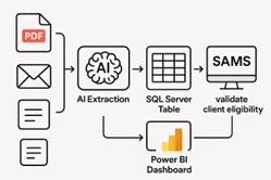 This diagram illustrates how authorization emails and PDFs move through the automation process, with AI extracting key data, SQL server storing the information, Power BI presenting it in dashboards, and the SAMS system validating client eligibility.